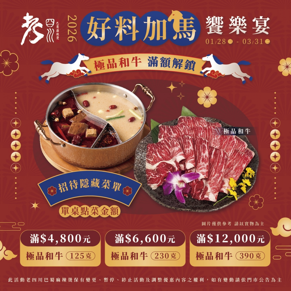 活動期間內至老四川全台門市用餐單桌發票消費金額滿額就招待「隱藏菜單—極品和牛」