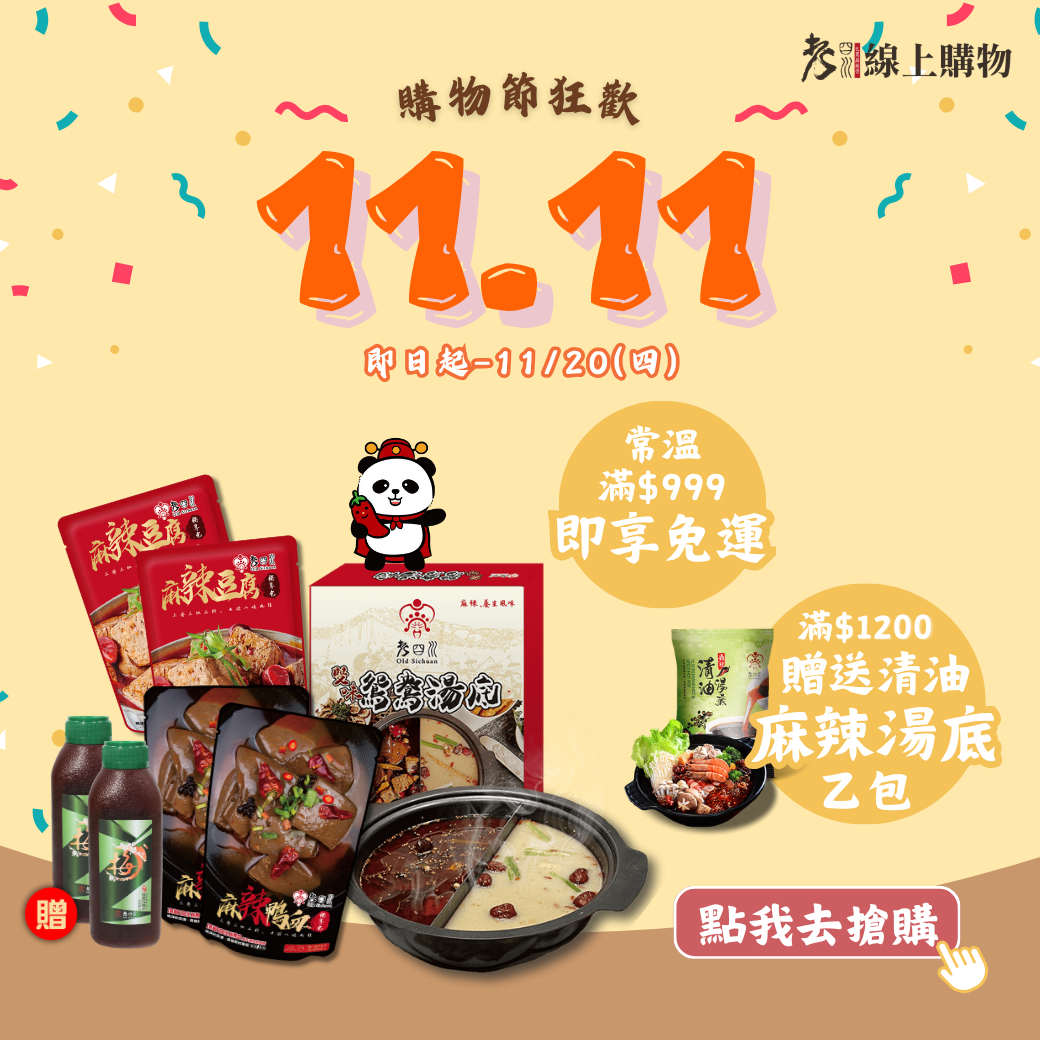 【老四川 X 11.11狂歡購物節來襲!全館滿$999免運費 還有滿額禮送給你】