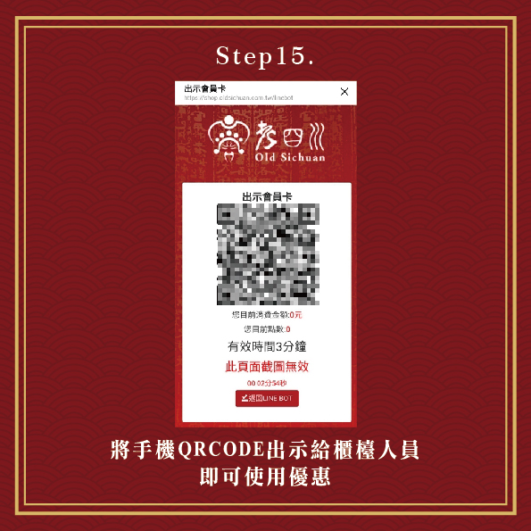 7.結帳時,請出示老四川巴蜀麻辣燙LINE虛擬會員卡QRCode給服務人員,未出示會員卡者無法折扣。